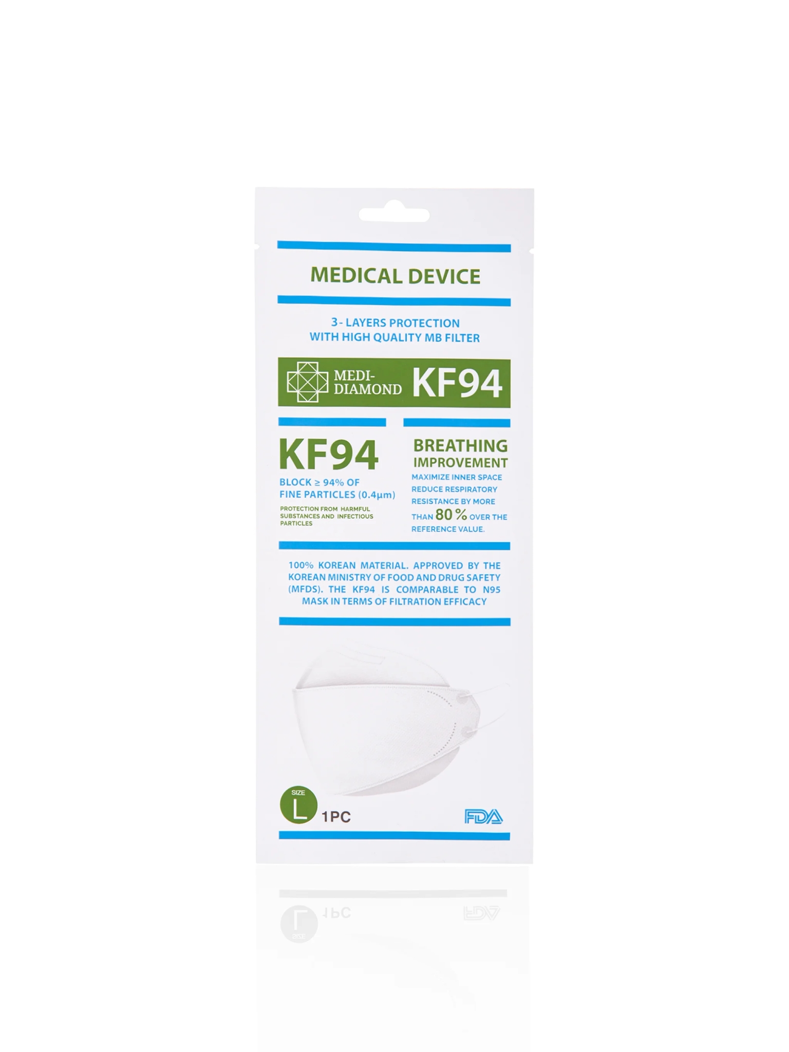 KF94 Block up to 94% of fine particles (0.4um) Protection from Harmful substance and Infectious particle.